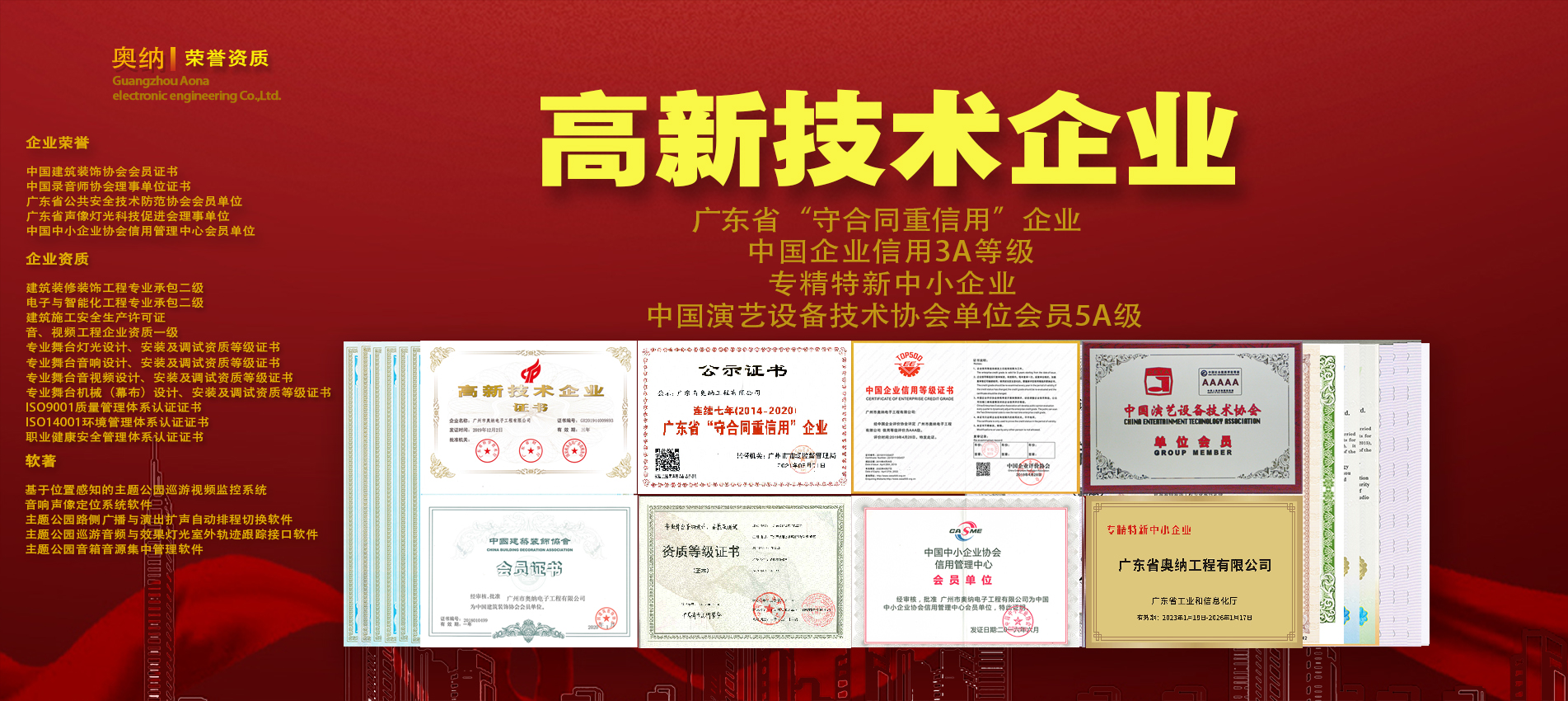 公司現擁有多項資質證書,獲得專利和軟著近百項,并先后榮獲百強工程商、優(yōu)秀文旅演藝獎等獎項,在科學化、標準化、規(guī)范化方面深得客戶信賴。公司參與建設的“華南理工大學國際校區(qū)圖書館”榮獲2022-2023年度中國建設工程魯班獎。